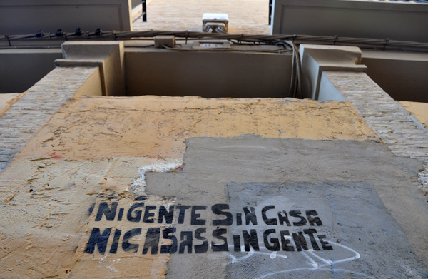 Un centenar de edificios en Zaragoza han amanecido el viernes 20 de enero con pintadas en diversos edificios que llevan años vacíos para denunciar su estado de abandono mientras miles de personas son desahuciadas de sus pisos por no poder pagar las hipotecas. Bajo el lema 'Ni gente sin casa, ni casas sin gente', esta acción se enmarca dentro de la intensa campaña desarrollada en las últimas semanas por diversas entidades sociales a iniciativa de Stop Desahucios Zaragoza y que conecta el intento de desahucio del guineano Mamadou previsto para el pasado miércoles y que fue aplazado por Caja Inmaculada, además de diversas movilizaciones, como el pasacalles que tendrá lugar este domingo en el Bº de la Madalena.