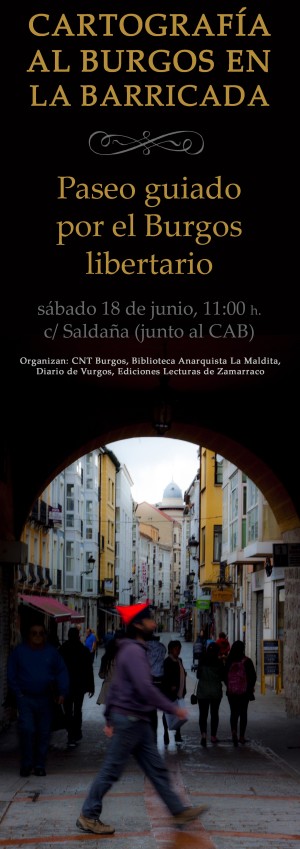 El recorrido histórico guiado, en el que se compartirá el trabajo de investigación realizado durante años en diversos archivos, viene organizado por CNT de Burgos junto con la Biblioteca Anarquista La Maldita, y cuenta con la colaboración de la Editorial Lecturas de Zamarraco y webs como Diario de Vurgos
