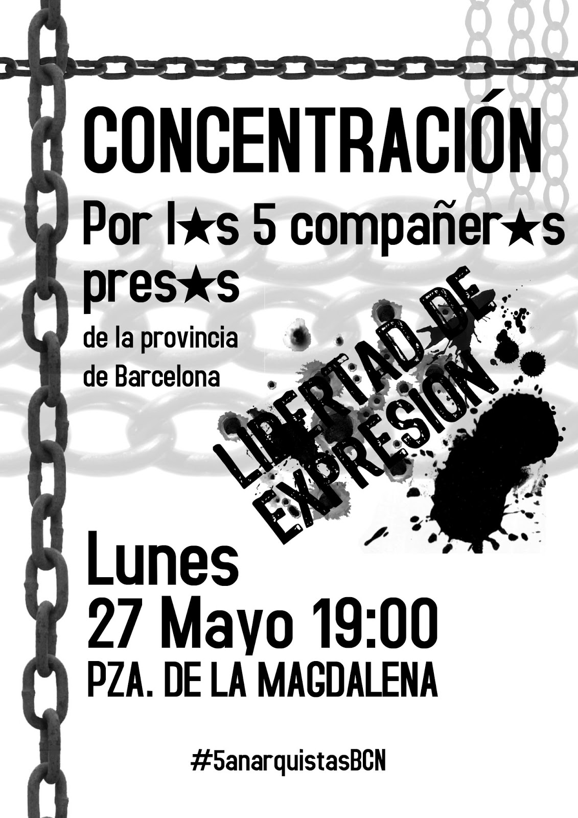 Como ya publicamos recientemente en un comunicado, este operativo no solamente ha sido un intento de criminalización de las luchas sociales, sino también un ataque directo contra la libertad de expresión de todas y todos. Por ello, en Zaragoza se realizará el lunes a las 19:00 en Plaza de la Magdalena una concentración exigiendo la libertad de los cinco anarquistas detenidos y en prisión provisional desde el miércoles 15 de mayo, así como el fin de la criminalizaicón de las luchas sociales y del movimiento libertario.