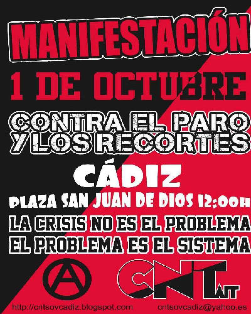 Desde CNT convocamos a todas aquellas personas que se sienten disconformes con la situación actual que nos impone el sistema. Paro y recortes estan a la orden del dia, una crisis que pagamos dia a dia los trabajadores/as y que en ningun caso hemos sido causantes de la misma. Todo esto únido a la precariedad diaria en los tajos, el acoso diario de las entidades financieras hacia los trabajadores/as , los recortes laborales y sociales que las marionetas politic@s sean del partido que sean practican jornada tras jornada , hace mas necesario que nunca que plantemos cara a estas medidas y decir Basta!!!! El SOV de Cádiz hace un llamamiento al conjunto de trabajadores/as, extensible a toda la ciudadania para mostrar nuestro desacuerdo con situación actual, porque la crisis no es el problema, el problema es el sistema, te esperamos el sabado 1 de octubre en la Plaza San Juan de Dios de Cádiz a las 12 h.