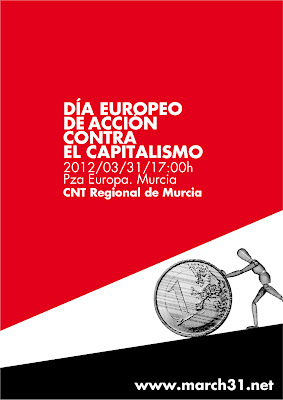 La gestión europea de la crisis es tan especulativa como lo ha sido siempre el capitalismo, pues los brutales recortes ponen en peligro tanto la estabilidad económica como el crecimiento en base al crédito. En el capitalismo no hay camino seguro, sino una gestión de la crisis permanente. ¿Vale la pena desperdiciar nuestra vida para esto? Mejor luchemos juntos contra los dictados de los mercados y organicémonos de una vez por todas en Europa. El día de acción europeo del 31 de marzo de 2012 es un primer paso en esta dirección. Las manifestaciones que tendrán lugar de forma simultánea en varios países europeos no son únicamente un símbolo de solidaridad anticapitalista, sino que ya son parte de un debate y de lazos a nivel europeo. Invitamos a todas las iniciativas de carácter emancipador a formar parte de la configuración de este proceso. Tenemos que organizarnos al margen de las vías institucionales y persistir en la lucha. La crisis se manifiesta de distintas formas según nuestros países, pero tenemos una meta en común: no queremos salvar al capitalismo, sino superarlo. Rechazamos las política de defensa de los intereses nacionales y las ideologías nacionalistas. Es importante la lucha contra el desmantelamiento continuo de los derechos sociales, pero nuestras perspectivas van más allá. Debemos acabar con los fatales imperativos del capitalismo y de sus instituciones políticas. La “democracia real”, exigida en muchas protestas, sólo es posible sin capitalismo.
