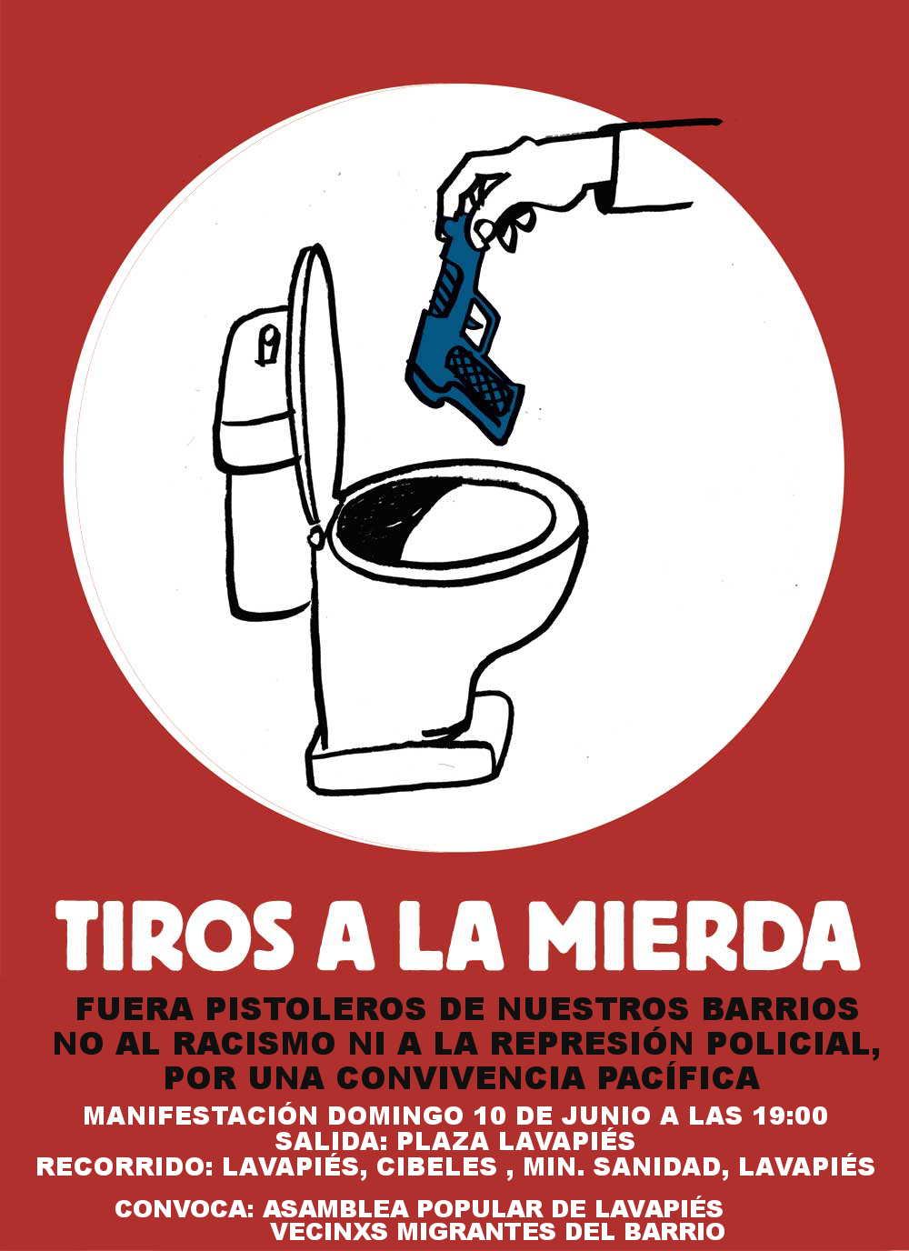 Como respuesta a la actuación policial, el domingo 10 de junio, la Asamblea Popular de Lavapiés y vecinos/as migrantes del barrio convocaron una manifestación por el centro de Madrid con el lema “¡Tiros a la mierda! ¡Fuera pistoleros de nuestros barrios!”.