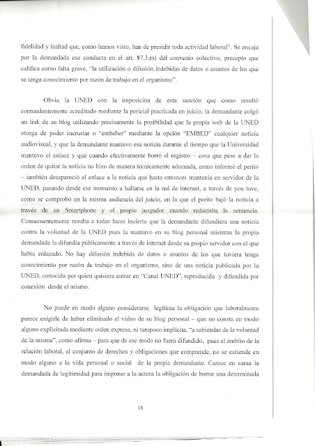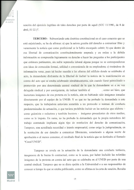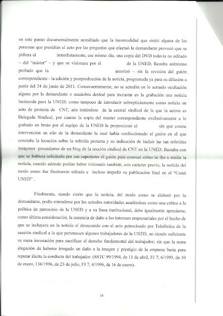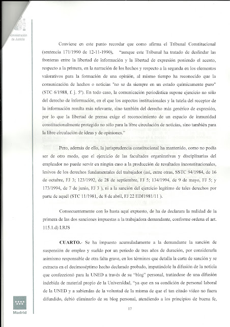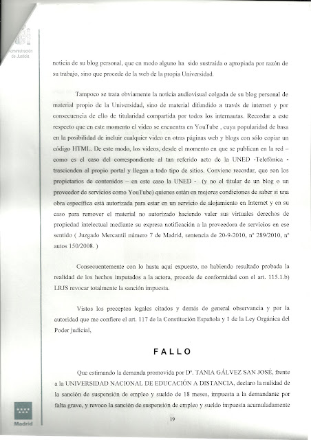 Como anunciábamos en el último comunicado enviado por esta sección, queremos informar a los trabajadores de que ya hay sentencia en el juicio de Tania, trabajadora del CEMAV, contra la UNED por las sanciones impuestas a nuestra compañera en el marco del acto de la cátedra de RSC de Telefónica-UNED. Y el sentido de la sentencia es absolutamente favorable a Tania. El juez declara la nulidad de la primera sanción, la de 18 meses de suspensión de empleo y sueldo, que se imponía por el cargo de deslealtad institucional. Y revoca completamente la segunda, de 3 años de suspensión de empleo y sueldo, por imputársele utilización indebida de datos que conocía por razón del cargo. A quien le interese puede echar un vistazo al contenido de los fundamentos de derecho (los fundamentos de hecho ya los dimos a conocer sobradamente en numerosas entradas de nuestro blog) de la sentencia, de la que hemos publicado algunos extractos más abajo, en que queda patente la actitud inconstitucional de la UNED hacia los derechos fundamentales y la absoluta falsedad de sus acusaciones contra Tania.