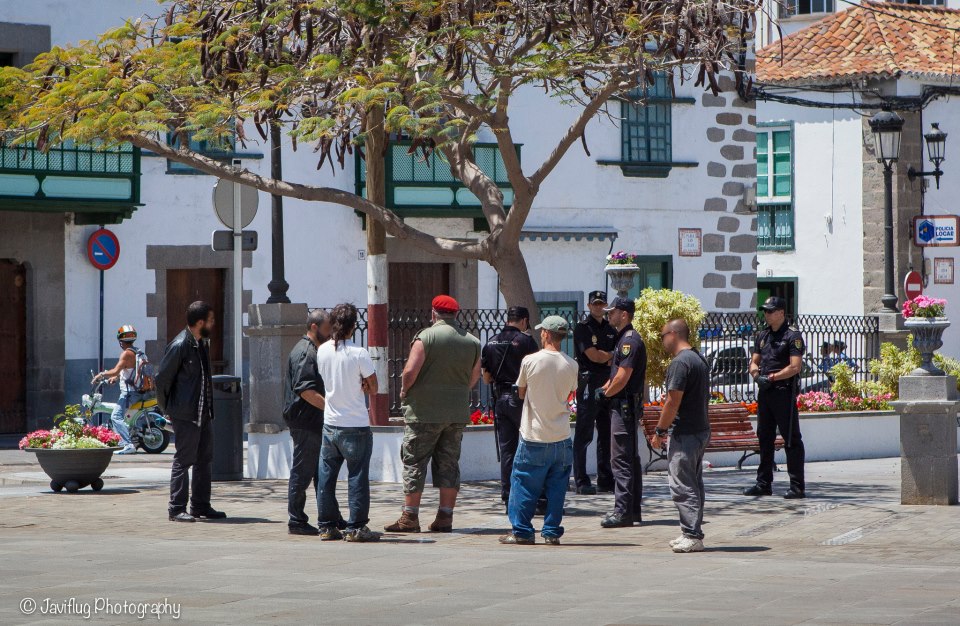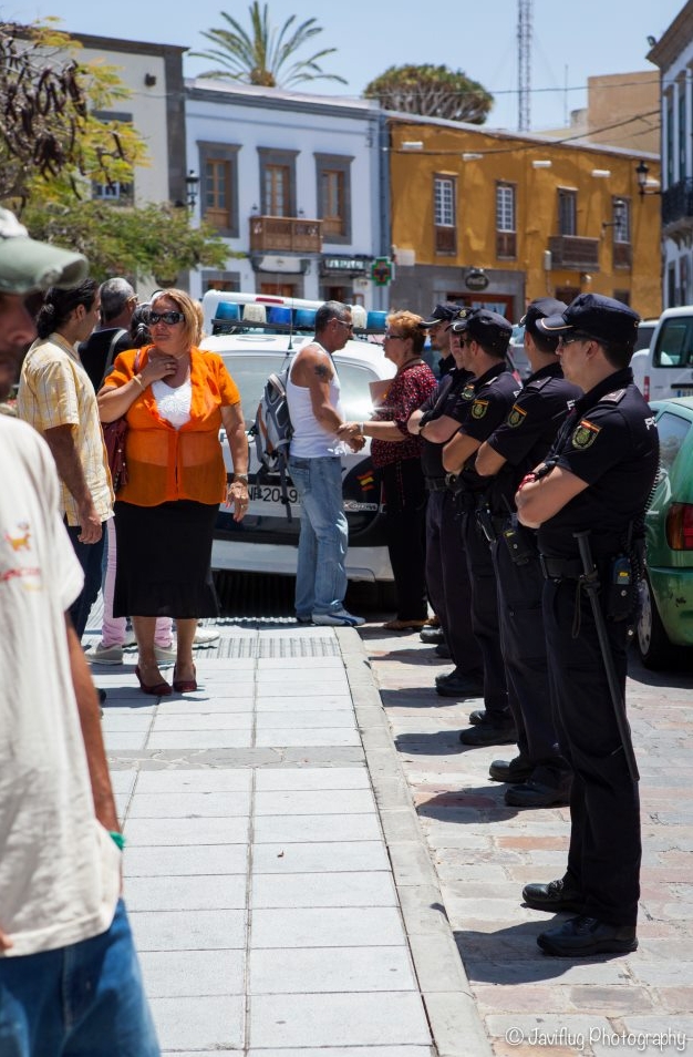 En el mismo se acusó a la casta política de ejecutar la más despiadada de las violencias contra las familias desahuciadas y de practicar verdadero terrorismo de Estado. “Terroristas” y “mentirosos”, “desahucio inminente para los dirigentes” y “que el próximo desahuciado sea un diputado”, fueron las consignas más repetidas. El despliegue policial fue enorme, y no menos de 30 policías, entre locales y nacionales, se personaron en el lugar, en formación, abarcando todo el perímetro del Ayuntamiento e incluso las calles aledañas. Finalmente los políticos se vieron obligados a salir entre abucheos, reproches y acusaciones. Todavía hay quien llama a esto violencia, mientras permanece impasible ante la visión de una familia arrojada a la calle, de unos niños secuestrados por el Estado o de unos afectados a los que en ocasiones les parece no tener más salida que buscar la forma más indolora de morir. Desconvocado el “escrache”, la policía identificó arbitrariamente, y con clara finalidad intimidatoria, a unos de nuestros compañeros. El agente que llevaba la voz cantante en esta intervención fue reconocido por nuestros compañeros como uno de los policías que los torturó a principios de año: Dos miembros de la FAGC son detenidos en Telde.