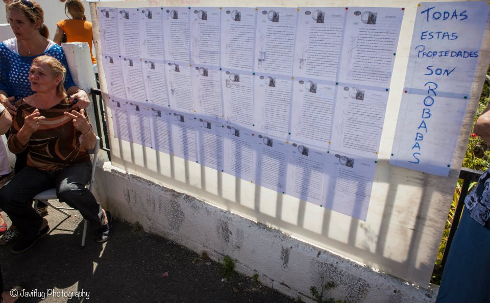 Nada más salir del improvisado parapeto se nos comunica que se requiere nuestra presencia en un desahucio que iba a producirse a las 11:30 (un caso que ya estaba en nuestra agenda de acciones, pero cuya afectada no quería convocar un piquete), pues finalmente la persona afectada había reconsiderado la situación y estaba dispuesta a paralizarlo por la vía de la resistencia. El drama personal es trágico: una familia que va a perder su casa (perteneciente a su familia desde hace más de 60 años) porque un cacique local dice que el antiguo propietario de la vivienda (el difunto padre de la afectada) le debía 19.000 pesetas (sí, pesetas) de agua para regadío (hay muchas otras familias en esta misma situación, a punto de perder su vivienda por la voracidad acaparadora de este mismo “aguateniente”). El magro piquete (no llegábamos 20), al que encomiablemente se había sumado Itahisa, José y algunos de sus familiares, se trasladó del Caracol a Lomo Magullo. Viendo que el número seguía siendo escaso, volvimos a la vía del apuntalamiento. Finalmente, y después de cerca de dos horas, se le comunica a la familia que el desahucio queda paralizado hasta dentro de un mes (el 31 de Mayo).