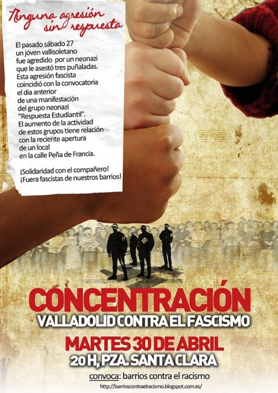 Durante la noche de este pasado sábado 27 un neonazi ha asestado tres puñaladas a un joven vallisoletano integrante de un grupo musical de la ciudad, teniendo que ser ingresado en el hospital clínico; actualmente se encuentra fuera de peligro. El agresor, quien tiene historial de varias agresiones y peleas, sigue en nuestras calles tranquilamente.