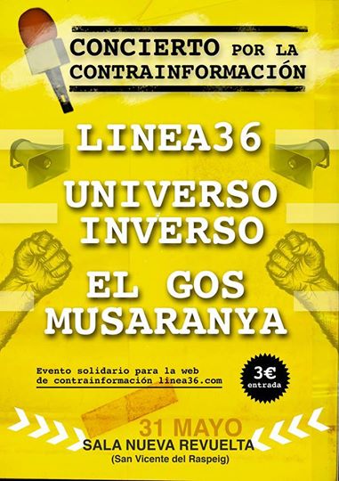 Como todos sabéis linea36.com esta pasando una etapa bastante delicada a lo que económicamente se refiere ya que los costes del servidor son bastante elevados debido a la capacidad que esta cogiendo la web. Para poder sufragar los coste del servidor estamos preparando un concierto solidario para el 31 de mayo en la Sala La Revuelta de San Vicent del Raspeig (Alacant) donde contaremos con la actuación de Universo Inverso, Linea36 y El Gos Musaranya, el precio de la entrada es de 3€ y se destinara de manera integra a la continuidad del proyecto en la red. Desde linea36.com no nos queda otra que pedir vuestra colaboración ya que sin vuestra ayuda seria más difícil la continuidad de linea36.com en la red.