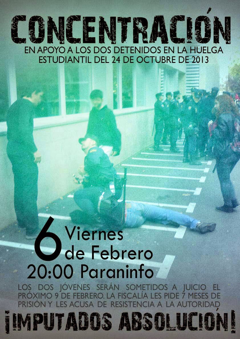 Gregorio G.M. y Samuel R.R. acudieron el día 24 a la huelga estudiantil que se convocó en todo el Estado y mientras se encontraban en el interior del campus universitario, cerca de una de las puertas, miembros de Unidad de Intervención Policial entraron en el recinto del Campus San Francisco de la Universidad de Zaragoza para reprimir las protestas -bajo permiso de Rectorado-, con la intención de detener a alguien a toda costa. Cuando los policías entraron al campus, cogieron a las dos personas que más cerca se encontraban y fueron automáticamente detenidas. Uno de ellos sufrió lesiones como consecuencia de la detención. Los dos detenidos son acusados de un delito de resistencia, cuando en realidad no opusieron ningún tipo de impedimento a la hora de su detención ni a la entrada de los agentes en el campus. El juicio se celebrará el 9 de febrero a las 09:45 en el Juzgado de lo Penal número 6 de Zaragoza, y el Ministerio Fiscal pide 7 meses de prisión para los dos jóvenes huelguistas.