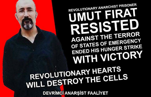 La lucha Umut Fırat fue tomada con determinación, y fue apoyado con acciones de solidaridad en la ciudad en que vive y en otras partes del mundo; se trata de añadir otras voces a la suya. Saludamos a todas las organizaciones revolucionarias que no lo dejaron sólo y todos los que solidarizaron durante la huelga de hambre del compañero Umut Fırat Süvarioğulları.