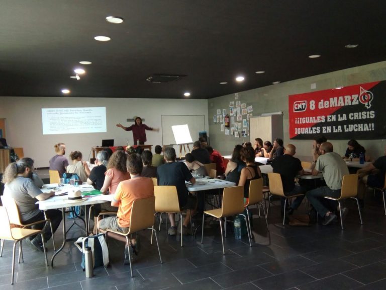 Han sido tres días de sesiones intensivas en las que compañeras y compañeros han compartido conocimientos y debates sobre distintos planos de la acción sindical. Se ha contado con la presencia de los sindicatos de Aranda de Duero, Aranjuez, Cáceres Norte, Córdoba, Guadalajara, Gijón, Iruña, Lebrija, Logroño, Madrid (Artes Gráficas y Espectáculos, Transporte y Oficios Varios), Valladolid, Villaverde y Zaragoza. También han estado presentes sindicatos de otros países con los que CNT mantiene relaciones fraternas y de colaboración: la FAU de Hannover y IWW de Colonia (Alemania) e IWW Londres.