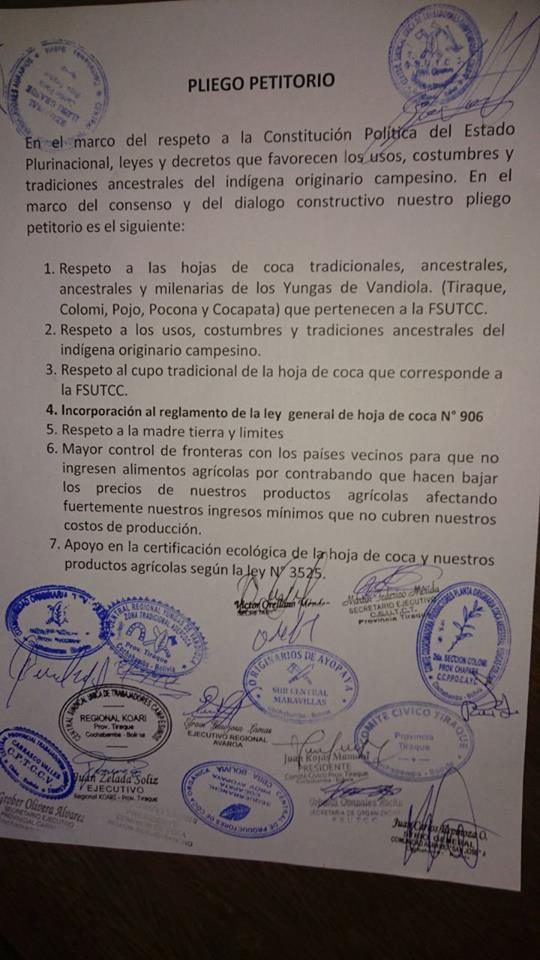 1. De la movilización participan cocaleros de Pojo, Colomi, Tiraque, Cocapata, Vandiola -zona de Arepucho- Todas ellas son parte de la yunga cochabambina, hábitat por excelencia de la coca domesticada.