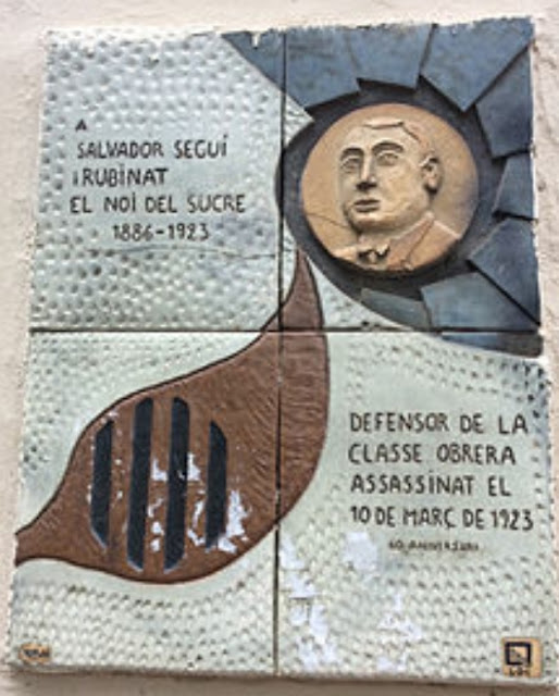 En esta ocasión se trata de Salvador Seguí y la placa que recuerda que fue asesinado en 1923 en Barcelona: defensor de la clase obrera. ¿Es posible una referencia más genérica? Pero es que a escasos metros está la Plaza Salvador Seguí, en la que figura un escueto: sindicalista (¿se les ha olvidado que era sindicalista de la CNT?).