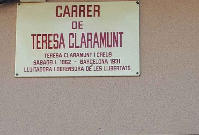La placa dedicada a Teresa Claramunt que da nombre a una calle de un barrio obrero de Sabadell también ha quedado falsificada al convertirla en luchadora y defensora de las libertades, ¿qué libertades? ¿las libertades de las constituciones democráticas? La Libertad con mayúscula se habría acercado algo a lo que fue (y es) Claramunt, feminista y anarquista dejaría muy clara du idiosincrasia.