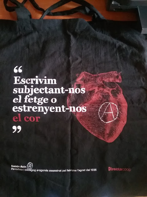 En esta tercera ocasión no es una placa sino una bolsa de tela que me propusieron comprar como suscriptora de la Directa, medio de información por la transformación en Cataluña. Sorprendentemente pone: Ramón Acín: Periodista y pedagogo aragonés asesinado por el fascismo en agosto de 1936. En este caso si entré en contacto con los responsables de la Directa para comentarles que se les había olvidado poner que era anarquista y que, justamente, eso es lo que explicaba su ejecución fulminante y lo que daba sentido a su figura. La respuesta fue espectacular: no lo pusieron, me dijeron, porque no les cabía. Les comenté que podían haber quitado periodista, pedagogo o aragonés para dejar paso a anarquista. Ya no hubo respuesta, ahí acabó nuestro diálogo por correo electrónico (por cierto, las dos A circuladas las he puesto yo).