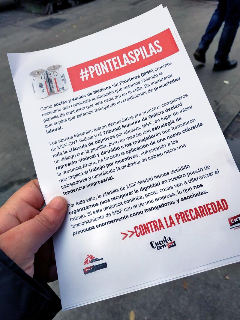 En noviembre de 2018, la sección sindical en Madrid interpuso una demanda contra MSF por la cláusula de objetivos, una estrategia que había utilizado CNT en Galicia, y con la que consiguieron que el Tribunal Superior de Galicia declara abusiva y nula por imponer unas ratios imposibles de cumplir. El máximo tribunal en Galicia dictaminó que los contratos laborales, que obligan a la captación de 24 nuevos socios por mes, son abusivos, por lo que ordenaba eliminar las cláusulas de productividad.