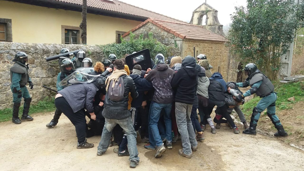 Tras el grito de"no somos actores, somos okupas", se aclara a la comisión judicial y a la Guardia Civil que no estamos ahí para figurar, que está resistiendo pacíficamente para defender un edificio que había sido abierto como centro social para todes y que la fundación propietaria quiere recuperar únicamente para llenarlo de cerraduras otra vez. Acaba la negociación y nos comunican que van a proceder a intervenir las "fuerzas especiales". Desfilan entonces treinta antidisturbios de una unidad de seguridad ciudadana, la USECIC, con sus porras, cascos, escudos y carabina de aire comprimido. Empiezan a cruzar por el prao aledaño donde la Guardia Civil había aparcado, disponiéndose a bajar al frente del Palaciu desde ahí.