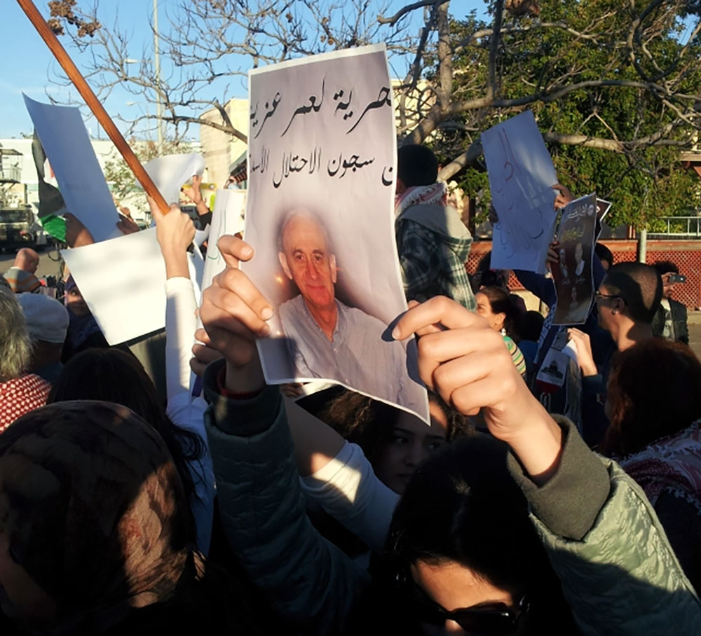 Cartel con la leyenda «Libertad para Omar Aziz» en una manifestación a favor del preso palestino Samer Issawi el 6 de febrero de 2013, en la Jerusalén ocupada [Cortesía de Budour Hassan].